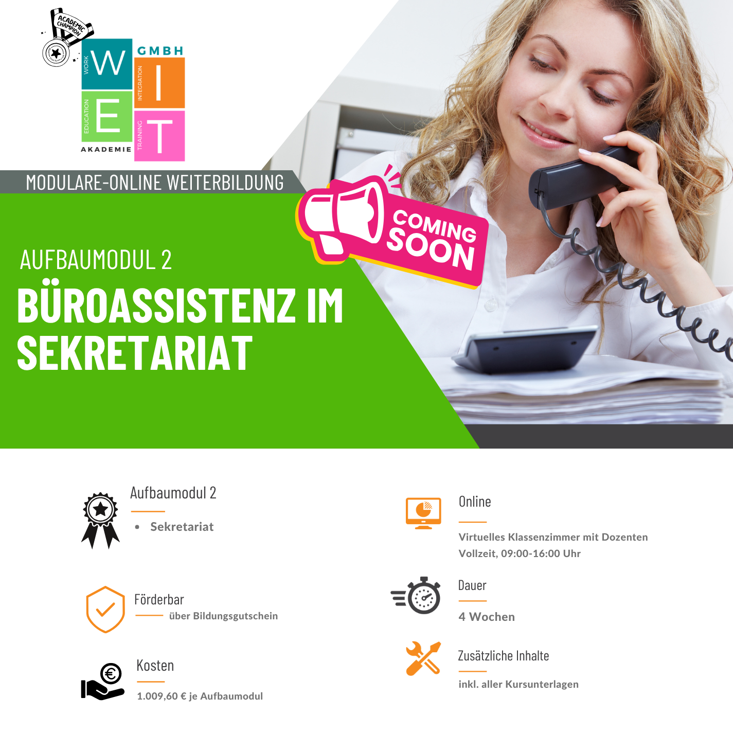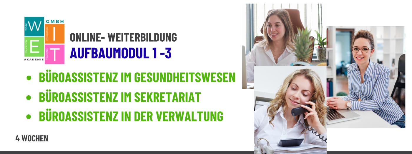 📌 Помощник по офисной работе в секретарской сфере: подходит для участников, которые после завершения базового модуля ищут работу в сфере секретарской работы. Особенно подходит для лиц с организаторскими способностями, сильными коммуникативными способностями и подходом, ориентированным на оказание услуг. Подходит для мигрантов и лиц, меняющих карьеру, с хорошим знанием немецкого языка (не менее B1/B2). 📌 Помощник по офисной работе в государственном управлении: подходит для участников, которые после завершения базового модуля хотят работать в государственном секторе или в организациях, тесно связанных с государственным управлением. Особенно подходит для лиц, интересующихся административными процессами, коммуникациями с общественностью и структурированной офисной работой. Подходит для мигрантов и лиц, меняющих карьеру, с хорошим знанием немецкого языка (не менее B1/B2). 📌 Помощник по офисной работе в здравоохранении: подходит для участников, которые после завершения базового модуля хотят работать в сфере здравоохранения или в медико-социальных учреждениях. Особенно подходит для лиц, заинтересованных в работе с пациентами и медицинскими организациями. Подходит для мигрантов и лиц, меняющих карьеру, с хорошим знанием немецкого языка (не менее B1/B2).